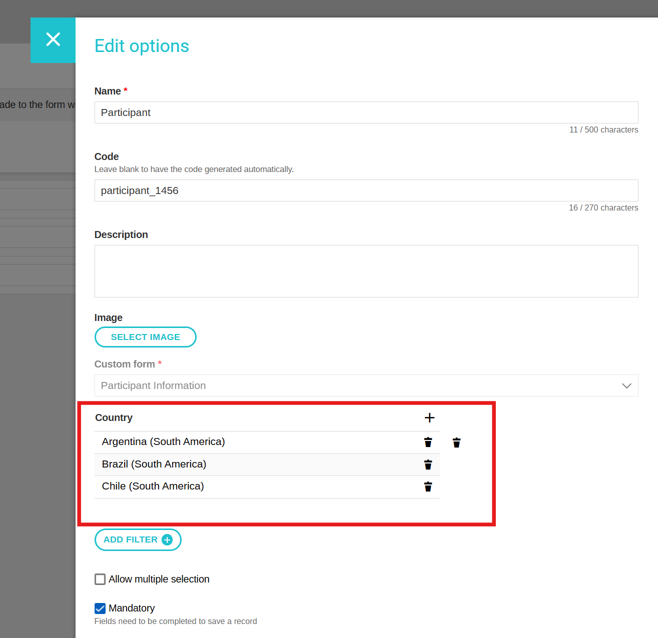 In the example below, a filter is applied on the Country field, only participants from Argentina, Brazil, and Chile will now appear in the dropdown list of options.