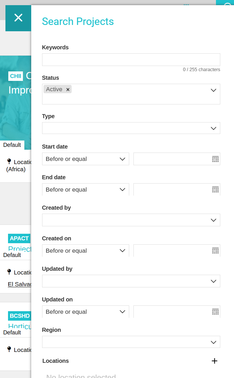 To search or filter projects from the "projects list" page: