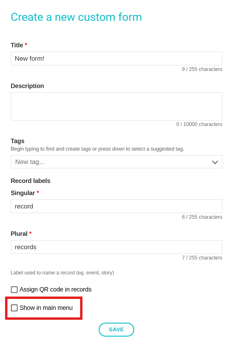 - New option: select “Show in main menu” to automatically display the form in the left-hand navigation menu once it is created.